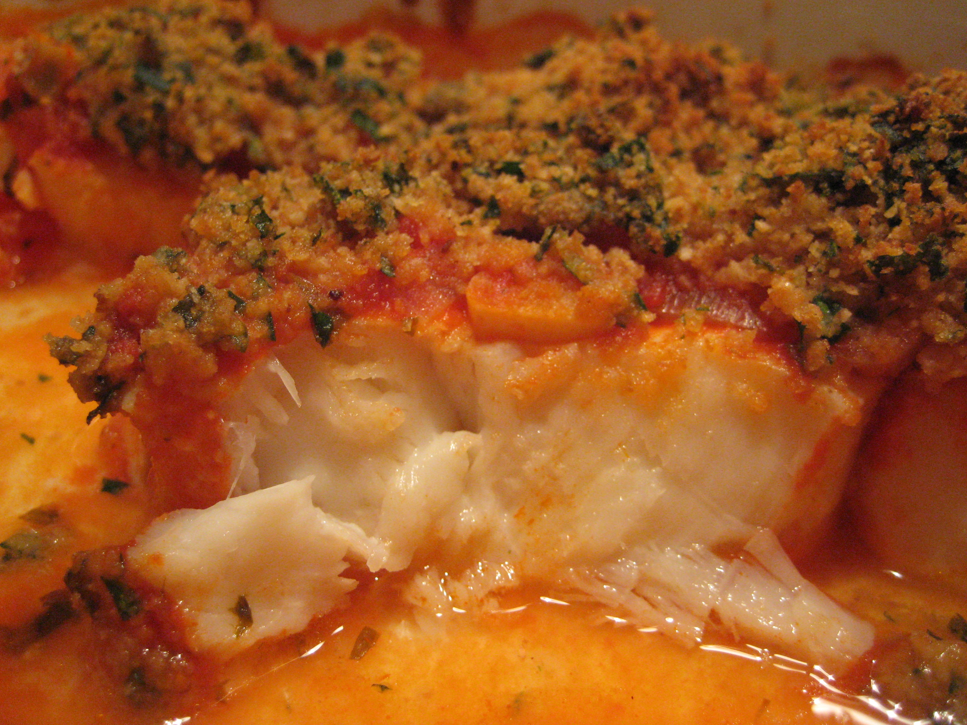 De skarpe fargene med rødt tomatlokek og grønt urtelokk på toppen og den hvite fisken gir et delikat og spennende inntrykk, og det er deilig med en frisk italiensk hvitvin til. Husk å ikke bak den for lenge da blir den tørr. Fisken skal være hvit og 8 minutter er passe i min ovn.