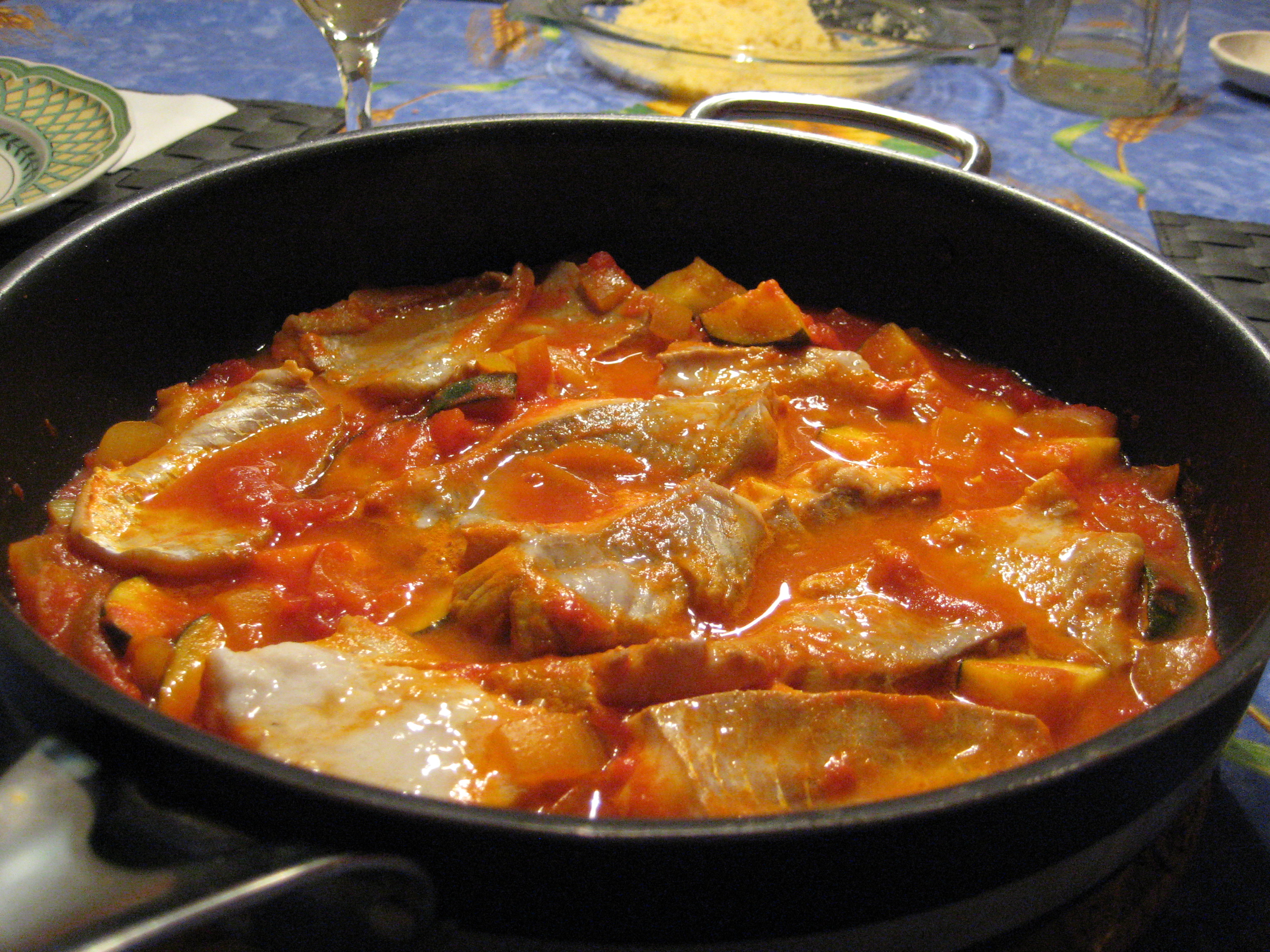 Brun løk, hvitløk og squash i olivenolje i en gryte eller høy panne. Tilsett safran/gurkemeie, tomatene, vineddik og vann og kok opp. La dette småkoke i 5 minutter. Smak til med salt og pepper. Legg fisken forsiktig over og la det dampe på svak varme under lokk i 10 minutter.