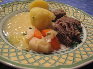 Server suppen først med grønnsaker først i måltidet. Neste omgang server du kjøtt med grønnsaker, kokte poteter og løksaus.