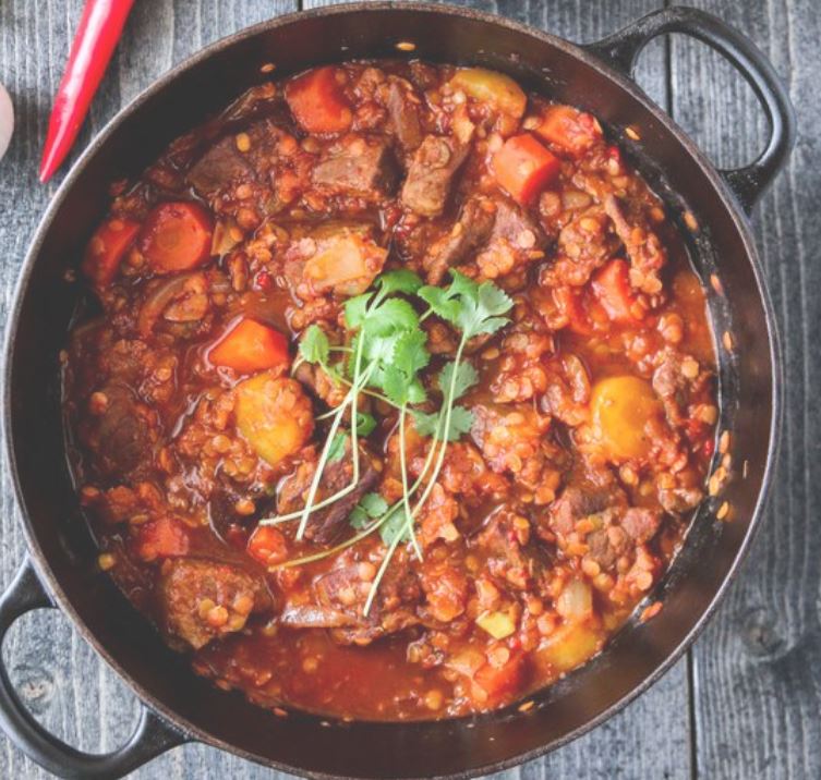 Sett på lokl og la gryten putre på svak varme i ca 1,5 time eller til kjøttet er mørt og ferdig kokt. Tilstt linsene.