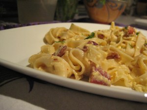 Hei, jeg brukte tynne spaghettini + eggeplommer fra fryseren (rester etter en kransekake en gang) + mye mer løk + røkt påleggsskinke i mindre biter + masse grovklippet flat persille fra hagen. Ellers HELT etter oppskriften. Ble så godt, så! 🙂