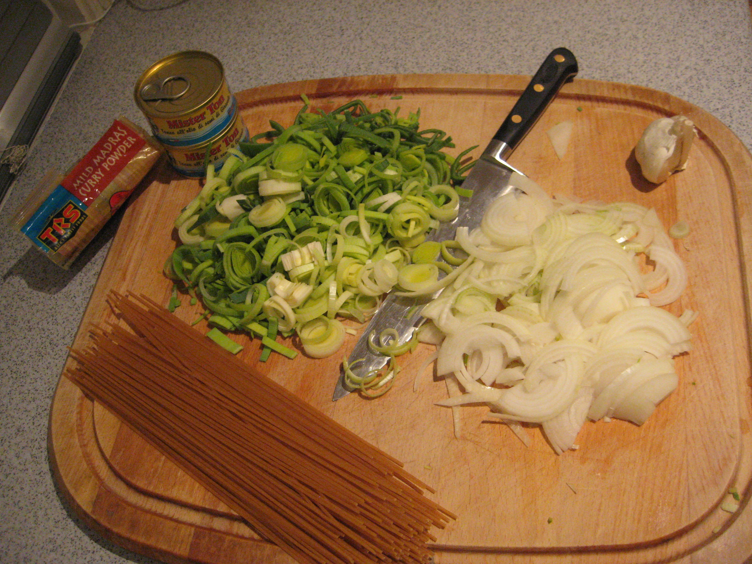 Det er helt utrolig at et lass med løk og purreløk sammen med tunfisk på boks kan bli en kjemegod spagetti. Karri gjør den spennende og her kan du prøve deg frem med hvor sterk du liker den.