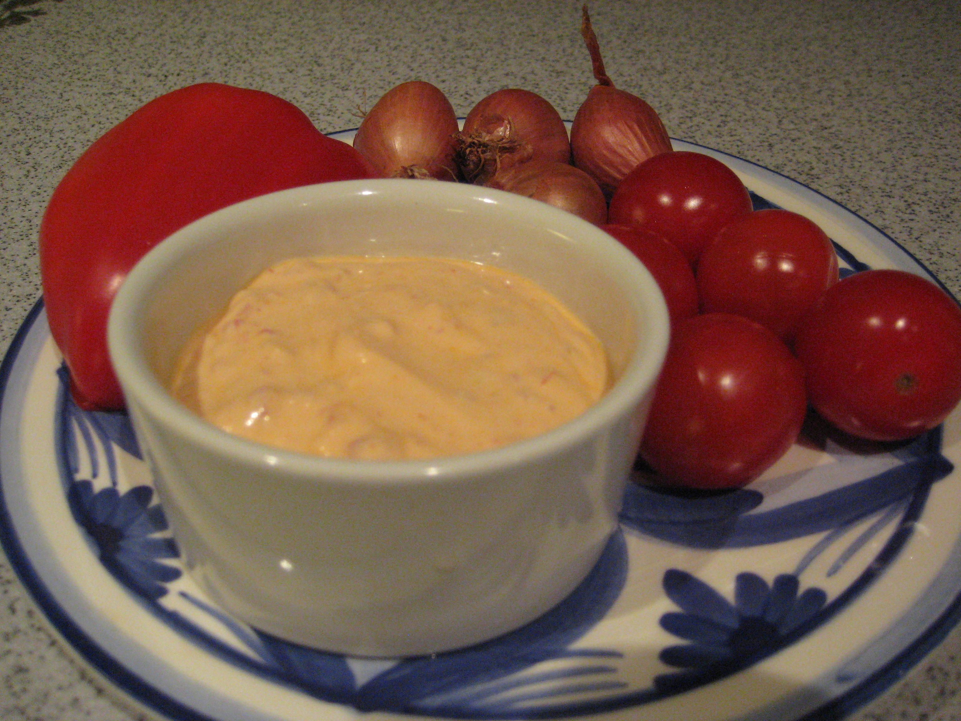 Bland alle ingrediensene sammen i en bolle og la det gjerne stå en halvtime slik at smakene har satt seg. Smak deg frem med salt, sukker og paprikapulver.