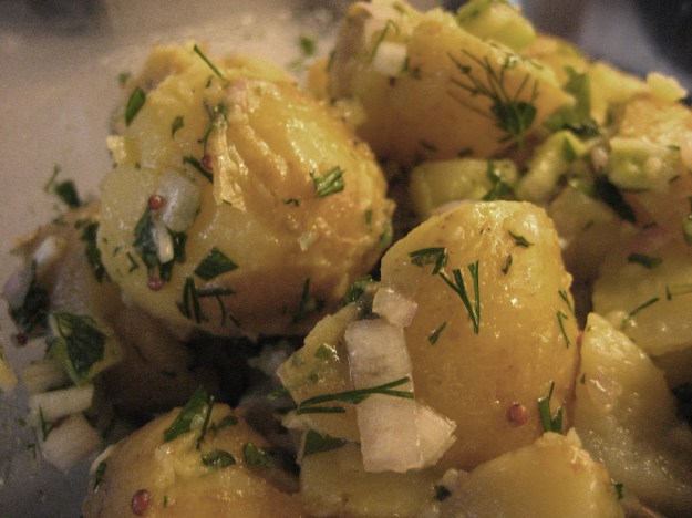 Denne potetsalaten er oppskrift fra svigermor. Den er frisk, lettvint å lage og passer til all grillmat. Det geniale er at du varierer smaken med hvilke urter du bruker, så her er fritt frem! Jeg bruker mer dill i potetsalaten til fisk, mens sitronmelisse og mynte passer til alt. Basilikum og timian gir den et italiensk preg. Og kokken på Sundvollen hotell ville nok brukt brennesleblader 🙂